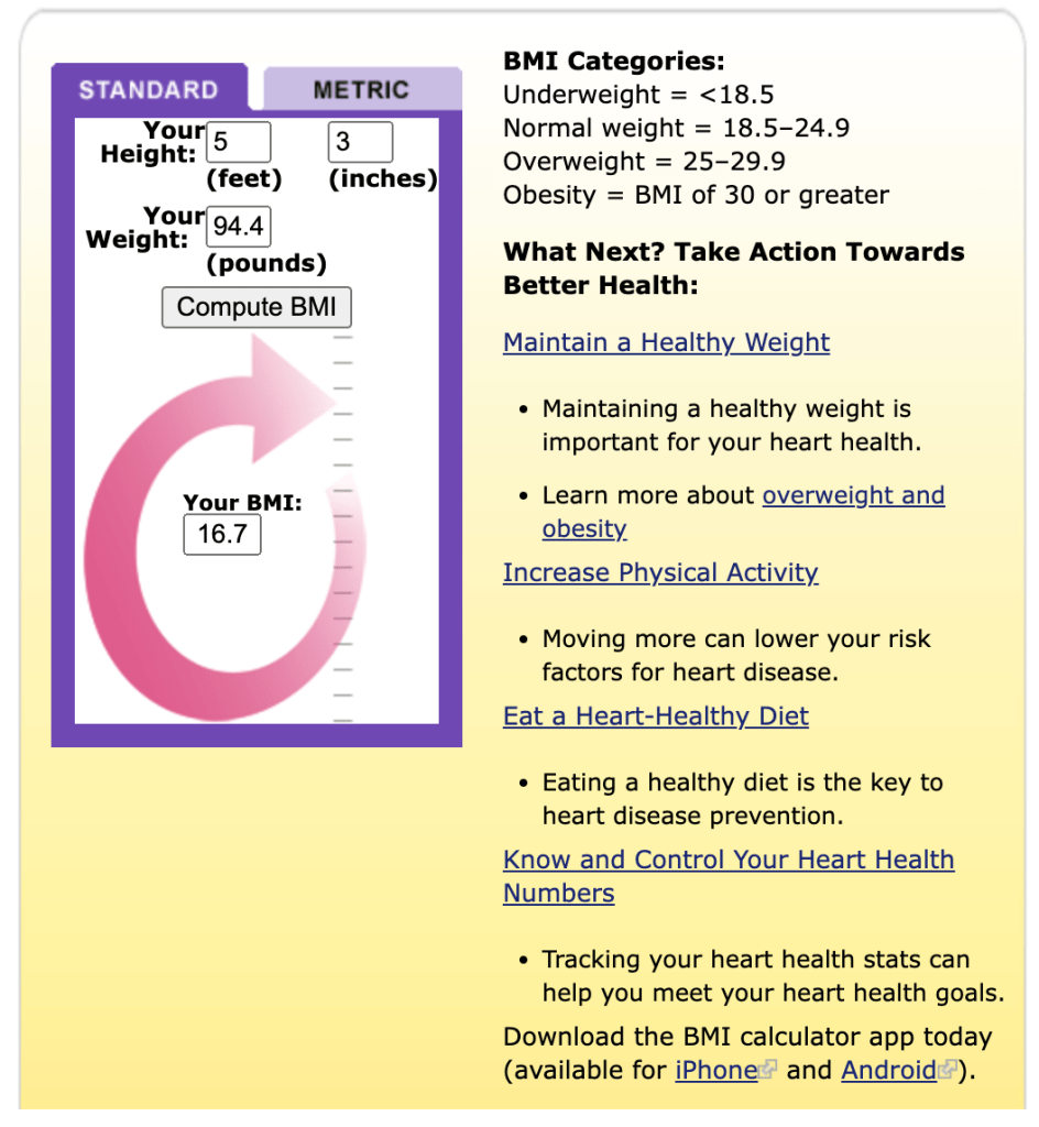 I use this BMI calculator. I’m hoping to include more education in this journey. I have no idea what BMI is. I have no idea if it’s an important metric to follow during this weight gain journey. But according to this, I would like to be a ‘Normal weight’.