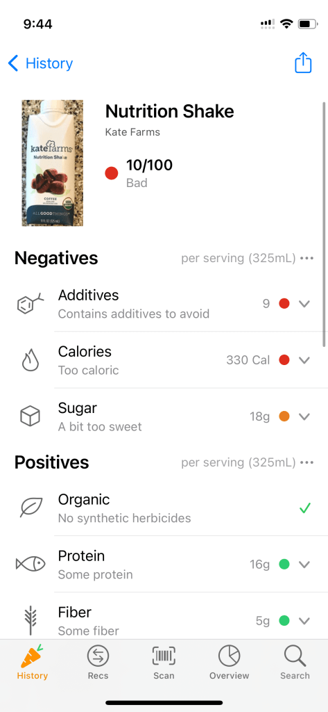 I use the Yuka app sometimes to see how “healthy” the foods I eat are. I scanned the Kate Farms shake and it showed “Bad – 10/100“. Which I’m not entirely sure how they measure “bad”. The only information they gave me was:
