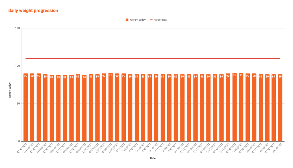 89 lbs – I am fully blaming my ~period~ on the slight decrease. I’m shedding a full-ass egg, like come on.