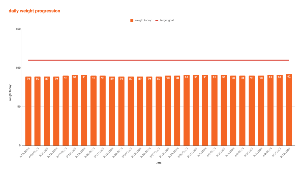 92 lbs – Is this the first time I’ve reached 92 lbs?! There might have been a day in April or May where I got to 92… but I had to limit the graph since it was getting a bit too crazy. Regardless, we’re making our way up!